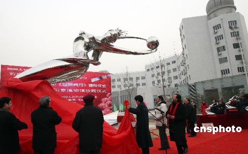 1月19日,中國科學(xué)院辦公廳、中國國家博物館、國家天文臺在北京中國科學(xué)院奧運村科技園聯(lián)合舉行大型雕塑作品“嫦娥奔月”落成揭幕儀式,同時舉行該作品由中國國家博物館永久收藏儀式。雕塑“嫦娥奔月”由中國著名雕塑藝術(shù)家遙遠先生創(chuàng)作完成,聯(lián)手四川舍得酒業(yè)集團贈送中國科學(xué)院。中新社發(fā) 錢興強 攝