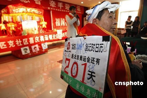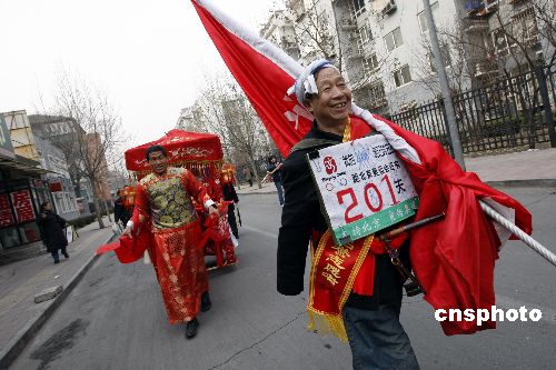 1月20日,山西“驢驢人”倪育生和來自山東的大花轎一起闖進了北京東四奧林匹克社區(qū),為迎接北京奧運會倒計時200天做宣傳。當日,來自全國7省市的民間奧運宣傳志愿者齊聚北京,相互交流奧運宣傳經(jīng)驗。中新社發(fā) 杜洋 攝