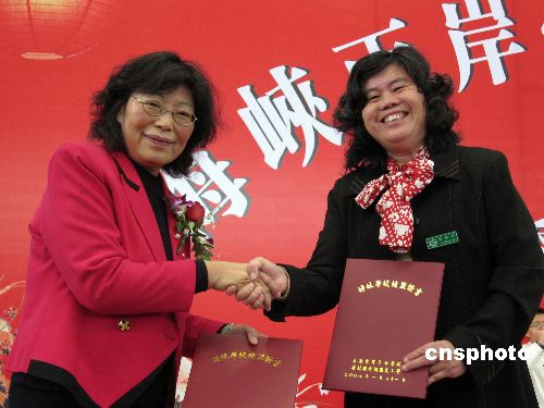一月二十一日,上海臺(tái)商子女學(xué)校代理校長(zhǎng)劉遼萍(左),與臺(tái)北縣秀朗“國(guó)小”校長(zhǎng)葉瑞芬在上海簽約締結(jié)姊妹學(xué)校。今后,雙方師生將展開(kāi)交流和研習(xí)活動(dòng)。據(jù)了解,大陸目前有三所專門(mén)服務(wù)于臺(tái)商子女的學(xué)校。中新社發(fā) 潘索菲 攝