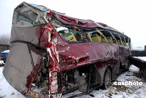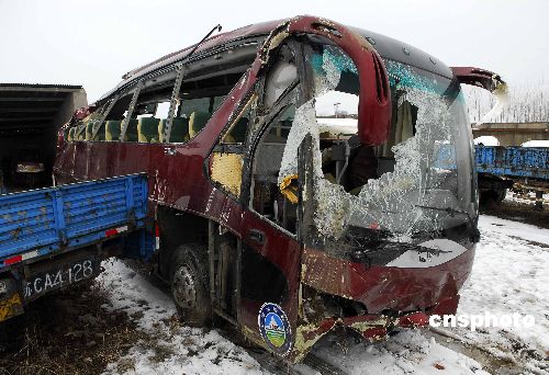 2008年1月20日深夜,一輛從蘇州發(fā)往安徽阜陽的大巴行駛至104國道明光市境內(nèi)時,翻下路邊溝內(nèi),造成7人當(dāng)場死亡。事故發(fā)生后,當(dāng)?shù)亟痪、醫(yī)院等部門火速趕到現(xiàn)場,實施救援。截至記者發(fā)稿時,已有11人死亡,51人不同程度受傷。傷者正在醫(yī)院接受治療,除了兩名重傷者沒有脫離危險外,其他傷者暫時無恙。據(jù)了解,此車核載51人,實載72人。事故原因具體尚在調(diào)查之中。中新社發(fā) 計成軍 攝