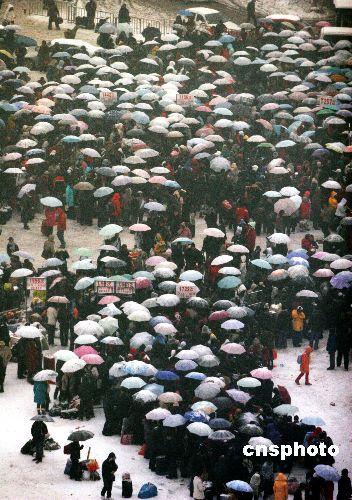 1月28日,漢口火車站廣場上客流爆滿,檢票進(jìn)站口乘客們在雪中艱難前移。武漢市連日來的強(qiáng)降雪給交通帶來極大不便,火車站因列車晚點(diǎn)、停發(fā),滯留了大量的旅客。中新社發(fā) 攝記 攝