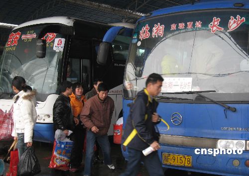 1月31日,湖南長沙汽車東站班車已經(jīng)開通,人們急切的上車回家。隨著冰凍的輕微緩解以及相關(guān)部門的奮力除冰,湖南部分高速公路和國道恢復(fù)通行,長沙汽車東、西、南三站的大部分客運(yùn)班車隨之恢復(fù)營運(yùn)。中新社發(fā) 劉雙雙 攝