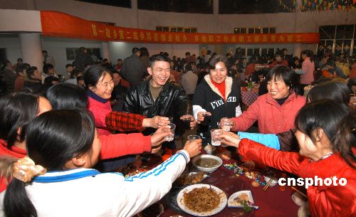 1月31日晚,浙江義烏一公司領(lǐng)導(dǎo)與留守在企業(yè)的400余名員工一起吃年夜飯。近段時(shí)間,由于遭受極端雨雪冰凍天氣,義烏100多萬(wàn)外來(lái)民工中有20多萬(wàn)人不能返鄉(xiāng)過(guò)年。中新社發(fā) 張建成 攝