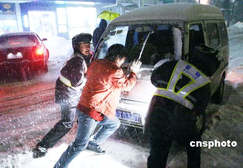2月1日晚,交巡警在推動(dòng)一輛陷于雪堆中的汽車。江蘇宜興市再次遭受暴雪襲擊,宜興市公安交巡警大隊(duì)的眾多交巡警冒雪到交通要道指揮交通,為群眾排憂解難。中新社發(fā) 丁煥新 攝