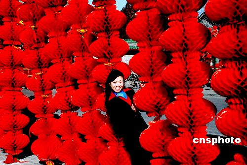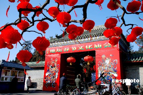 2月5日,北京地壇公園門口裝飾一新、喜氣洋洋。從2月6日到13日,北京地壇將舉辦2008年北京特色傳統(tǒng)廟會(huì)。今年的廟會(huì)除了傳統(tǒng)的民俗表演項(xiàng)目外,還將川劇、吉尼斯奇人絕技等引進(jìn),更加豐富多彩。中新社發(fā) 楊慧峰 攝