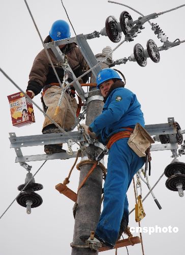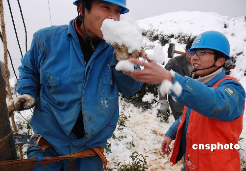 2月6日,電力搶修隊員在海撥600米的高山雪地里吃年夜飯。據(jù)悉,近日雪災(zāi)造成浙江嵊州21條主要供電線路中斷供電,該市供電局每天出動500余人進行抗災(zāi)自救。2月6日,該市供電局200多名黨員干部組成6支電力搶修突擊隊員,對該市貴門、里南、長樂3個未通電鄉(xiāng)鎮(zhèn)開展春節(jié)供電大會戰(zhàn),當(dāng)晚6時前,該市全面修復(fù)供電,實現(xiàn)新春零斷電。中新社發(fā) 張亮宗 攝