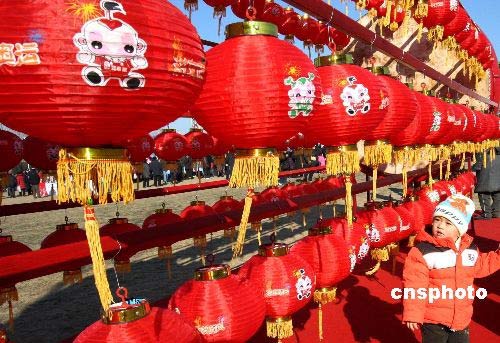 2月21日,是中國傳統(tǒng)的元宵佳節(jié),北京許多公園舉行豐富多采的元宵燈會活動,圖為在北京朝陽區(qū)舉辦的元宵燈會上繪有喜迎奧運卡通圖案的紅燈吸引小朋友。中新社發(fā) 錢興強(qiáng) 攝