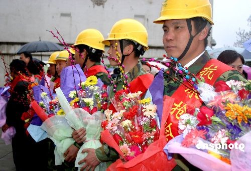 2月25日,江西贛東北供電公司50余名電力隊員,完成井岡山抗冰雪搶修任務(wù)后,從井岡山回到樂平。當(dāng)日,千余名贛東北供電領(lǐng)導(dǎo)、搶修隊員家屬和樂平群眾冒雨相迎。中新社發(fā) 王國紅 攝