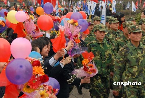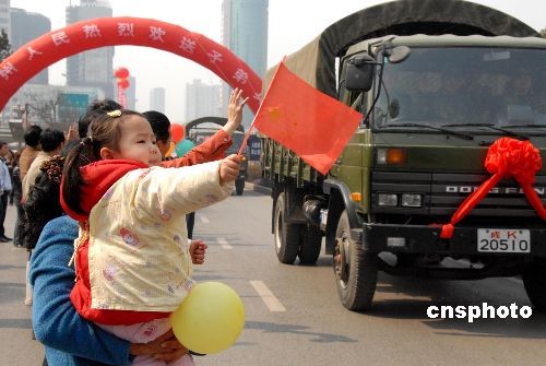 2008年3月5日,貴陽市人民廣場(chǎng),援黔抗凝凍部隊(duì)返程受到社會(huì)各界人民群眾夾道歡送。據(jù)悉,貴州省在受凝凍災(zāi)害期間,得到中國(guó)人民解放軍及社會(huì)各界的援助,電力搶修按預(yù)期提前190余天完成,目前貴州送往省外的電路全部投入送電。中新社發(fā) 張?zhí)炝?攝