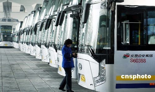 3月8日,北京首批采用“京劇臉譜”造型的50部新型環(huán)保雙層公交車亮相三環(huán)路,它們將在本月10日替換下特8路內(nèi)環(huán)原有的舊雙層車,改善交通環(huán)境服務奧運!靶码p層”車身長12.6米,滿載量達100人,使用歐IV柴油發(fā)動機。首批50輛新車主色調(diào)呈銀灰色,下個月還將有13輛新車上路。中新社發(fā) 鄭雄增 攝