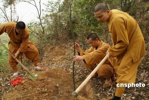 3月12日中國植樹節(jié),廣東南海西樵山寶峰寺的僧侶在西樵山國家森林公園參加植樹造林。有珠江西岸文明燈塔之稱的廣東南海西樵山國家森林公園,經(jīng)過多年植樹造林,森林覆蓋率已達到90%以上。中新社發(fā) 孫建駒 攝