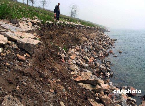 2008年3月18日,枝江市白洋鎮(zhèn)向家壩沙灣堤外垸,崩塌的長江堤防。據(jù)悉,自3月10日以來,湖北枝江市白洋鎮(zhèn)向家壩沙灣堤外垸長江堤防連續(xù)發(fā)生崩塌。該處垸堤長1750米,崩長360米,崩坎平均高1.5米至3.5米,最高處達(dá)5米;垸內(nèi)有14戶人家,耕地183畝。據(jù)專家分析,該堤段崩岸主要原因是:一、清水下泄,崩岸處正處清江河口對岸,迎流頂沖,護(hù)坡腳槽形成吊坎后崩垮;二、長江近年處在中低水位運(yùn)行,護(hù)坡處淤沙沖失后未及時(shí)維護(hù)。目前,枝江正在組織勞力、機(jī)械、石源對該段進(jìn)行突擊整治,力爭汛前全面脫險(xiǎn)。中新社發(fā) 劉君鳳 攝