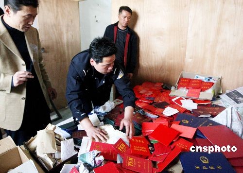 3月19日,河南洛陽(yáng)警方在一民宅內(nèi)將一伙制造假證的犯罪集團(tuán)逮個(gè)正著。行動(dòng)中查獲各類假證7大類145種共計(jì)10000多份,現(xiàn)場(chǎng)還查獲印章、鋼印、電腦、打印機(jī)等一批制假造假設(shè)備。在事實(shí)面前,犯罪嫌疑人對(duì)犯罪事實(shí)供認(rèn)不諱。中新社發(fā) 曾憲平 攝