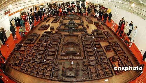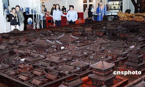 3月20日,為期5天的“第六屆全國(guó)工藝品、旅游品、禮品博覽會(huì)暨第十一屆春季(大連)中國(guó)古玩藝術(shù)品博覽會(huì)”在大連星海會(huì)展中心舉行。在展會(huì)西廳區(qū),一個(gè)一展現(xiàn)古都風(fēng)貌喜迎2008年奧運(yùn)會(huì)為創(chuàng)作宗旨的按正式比例縮小120倍的紫檀巨雕故宮全景,吸引了眾多市民的眼球。這個(gè)作品9米長(zhǎng),寬7米,總面積60余平方米,由50余位高級(jí)技師歷時(shí)6年精心雕制而成。該作品無(wú)論從用料、耗時(shí)都令人稱(chēng)絕。如此大型紫檀木雕藝術(shù)作品也實(shí)屬罕見(jiàn)。中新社發(fā) 劉德斌 攝