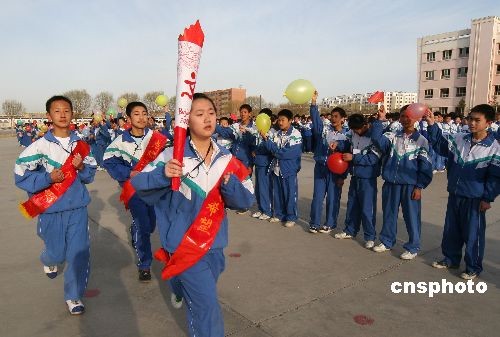 3月24日,為慶祝北京奧運(yùn)圣火在希臘采集,新疆哈密市六中舉辦了“傳遞火炬 點(diǎn)燃激情”為主題的體驗(yàn)奧運(yùn)火炬?zhèn)鬟f活動(dòng),千余名學(xué)生參加了體驗(yàn)傳遞奧運(yùn)火炬活動(dòng)。中新社發(fā) 普拉提 攝