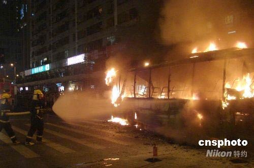 四月九日晚二十一時(shí)三十分許,重慶市區(qū)一輛載有十余名乘客的公交車在行進(jìn)中起火燃燒。消防人員迅速趕到現(xiàn)場(chǎng)撲救,由于乘客疏散及時(shí),未造成人員傷亡。出事公交車燒得面目全非,起火原因在進(jìn)一步調(diào)查中。中新社發(fā) 萬明 攝