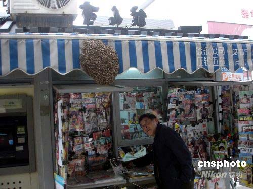 4月13日,蘇州人民路上一家信息亭的遮陽棚上聚集了大量的黃蜂,嚇得路人躲而避之。據(jù)悉,當(dāng)日中午12點(diǎn)左右遮陽棚上還只是幾只黃蜂,后來越積越多,至下午5時(shí)左右已形成一個(gè)巨大的黃蜂窩,蜂窩直徑達(dá)40厘米,厚度也達(dá)4厘米,晚上9時(shí)左右黃蜂窩被消防官兵成功摘除。據(jù)行家分析,其原因可能是中午蜂王停在了信息亭的遮陽棚上,才引來大量的黃蜂聚集在了一起。中新社發(fā) 王建康 攝