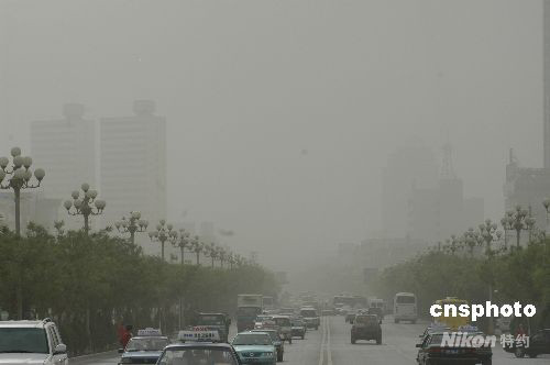 5月4日下午,被沙塵覆蓋的新疆庫爾勒市街頭。連日來,新疆南部塔里木盆地大部分地區(qū)持續(xù)出現(xiàn)的沙塵天氣,使當(dāng)?shù)鼐用裆詈徒煌ǔ鲂惺艿揭欢ǔ潭扔绊。中新社發(fā) 確·胡熱 攝