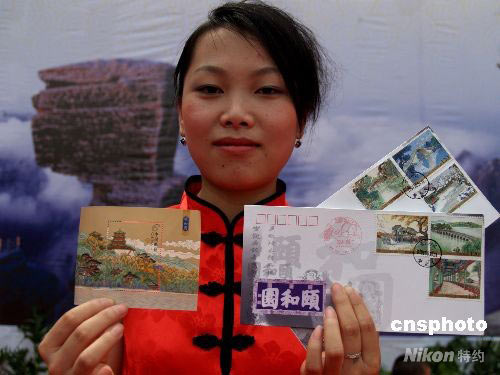 5月10日,印江郵政工作人員展示《頤和園》郵票。當(dāng)天,《頤和園》特種郵票一套6枚和1枚小型張?jiān)谫F州印江首發(fā), 印江土家族苗族自治縣舉辦了慶!额U和園》特種郵票發(fā)行活動(dòng)!额U和園》郵票內(nèi)容是十七孔橋、長廊、石舫、諧趣園、玉帶橋、后湖,小型張是佛香閣。這套郵票是繼長城、故宮、天壇后發(fā)行的又一套北京名勝題材郵票!额U和園》三個(gè)字,是清代書法家、貴州印江的嚴(yán)寅亮所書。中新社發(fā) 陳曉嵐 攝