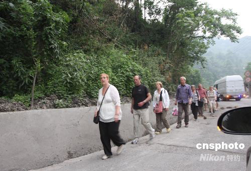 道路中斷 中外游客徒步向都江堰方向前行
