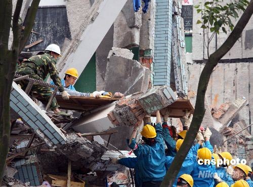 5月13日中午,四川省綿竹市漢旺鎮(zhèn)東方汽輪機廠子弟學(xué)校——東汽中學(xué)的垮塌校舍里,被困近一天的學(xué)生被救出。12日,四川汶川縣發(fā)生7.8級地震,而漢旺鎮(zhèn)與汶川僅一山之隔,距離30余公里,受到嚴(yán)重破壞。中新社發(fā) 郭晉嘉 攝