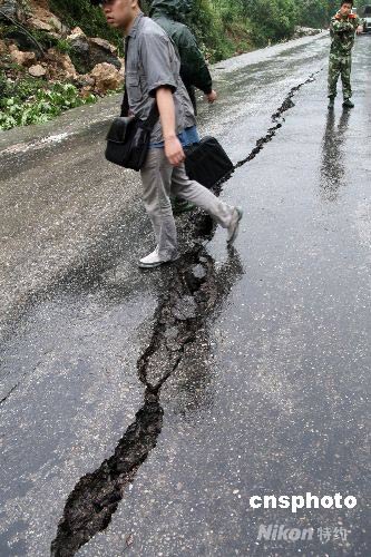 5月13日,通往四川地震重災(zāi)區(qū)綿陽(yáng)市北川縣的公路上,出現(xiàn)一段段寬窄不等的嚴(yán)重裂縫。據(jù)稱,目前通往北川老縣城的唯一道路已被大石阻斷,只能步行攀爬通過(guò)。中新社發(fā) 郭晉嘉 攝
