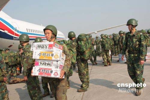5月13日,空降兵6500多名官兵分別乘坐空軍遠(yuǎn)輸機(jī)奔赴四川重災(zāi)區(qū),分五路兵力,分別在什邡、德陽、茂縣、等重災(zāi)區(qū)展開救援。圖為空降兵自帶干糧出發(fā)。中新社發(fā) 譚超 攝