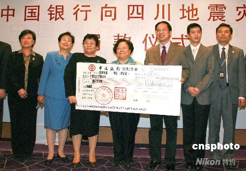 5月14日,中國銀行在北京舉行捐贈儀式,向中國紅十字總會捐款1000萬元人民幣,用于汶川地震災區(qū)援救工作。中國紅十字總會會長彭佩云代表協(xié)會接受捐款。至此,中國銀行集團已向災區(qū)捐款近2300萬元人民幣,是目前對此次抗震救災捐款數(shù)額最大的企業(yè)。中新社發(fā) 廖文靜 攝