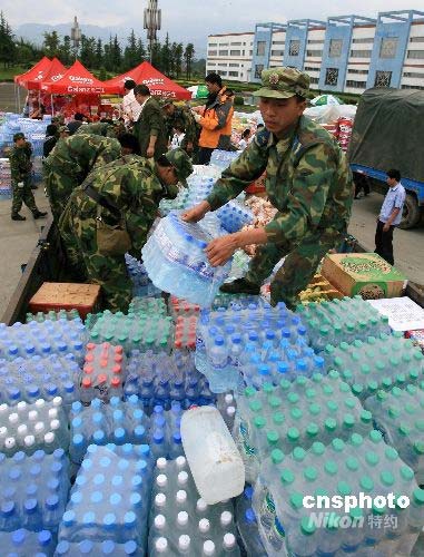 5月14日,四川都江堰市郊的臨時救災物資集散中心,堆積如山的物資通過組織部門和志愿者、支援車輛向各災區(qū)發(fā)放,盡快送到災民手中。一些郊區(qū)農民自己將熱飯送進市區(qū)災民手中。中新社發(fā) 周青先 攝