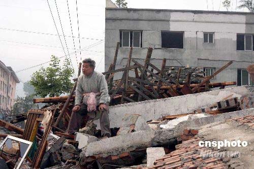 四川大地震,從都江堰到汶川縣映秀鎮(zhèn)沿線民房和交通受損嚴(yán)重,許多受困的居民紛紛離家趕往安全地點(diǎn),也有許多居民想回家看往地震區(qū)的親人。圖為14日 ,一直堅(jiān)信老伴還活著的居民在自家的廢墟前等待救援。中新社發(fā) 黃榮 攝
