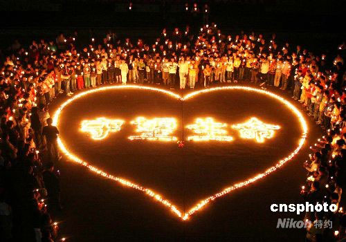 5月15日晚,山西省太原市雙語實(shí)驗(yàn)小學(xué)400多名師生在校園操場上,將3000余支蠟燭擺成一個(gè)巨大的“心”和“守望生命”四個(gè)字,為四川災(zāi)民祈福。中新社發(fā) 華山大 攝