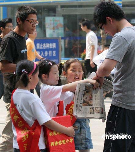 圖:南京兒童義賣報(bào)紙捐助災(zāi)區(qū)小朋友