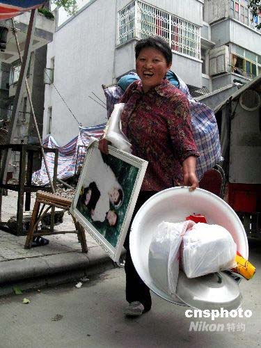 四川都江堰市蒲陽(yáng)大道兩側(cè)居民建筑在大地震中造成致命性的破壞,已經(jīng)不能住人,不久將要徹底拆除。圖為一名婦女在余震較輕時(shí),冒險(xiǎn)回家取出生活用品,告別家園。中新社發(fā) 鄒憲 攝