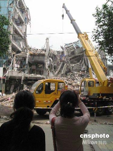 5月16日,抗震救災(zāi)人員在四川都江堰市一邊搜死者,一邊拆除建筑廢墟。5月12日中國汶川大地震,四川都江堰市內(nèi)絕大部分建筑出現(xiàn)致命性破壞,造成許多人員傷亡,大部分建筑失去使用價(jià)值。中新社發(fā) 鄒憲 攝