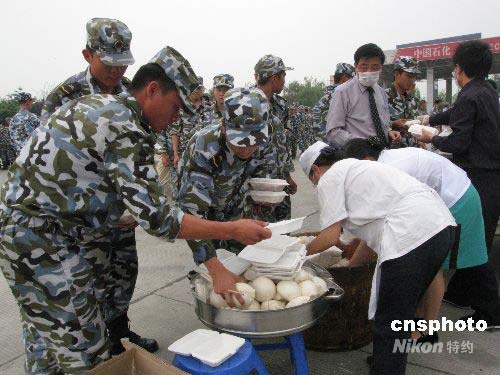 五月十六日十二點(diǎn)二十分許,一支從海南星夜兼程趕來(lái)的、有一千余名官兵組成的抗震救災(zāi)隊(duì)伍到達(dá)成都成南高速路口加油站,早早等候在這里的成飛賓館工作人員,迅速為戰(zhàn)士們提供上盒飯、饅頭等飯菜。僅二十分鐘戰(zhàn)士們就用完飯菜,稍事休整后就出發(fā)趕往受災(zāi)。中新社發(fā) 周丹鈺 攝