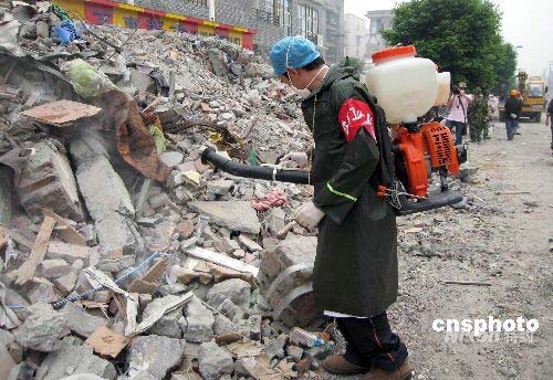 五月十七日,是汶川地震發(fā)生時(shí)間第六天,地震災(zāi)區(qū)都江堰市最大的市場(chǎng)荷花池市場(chǎng)已開(kāi)始用大型挖掘機(jī)、裝載機(jī)清理倒塌的樓房和廢墟,并有專業(yè)人員進(jìn)行防疫消毒。中新社發(fā) 周丹鈺 攝