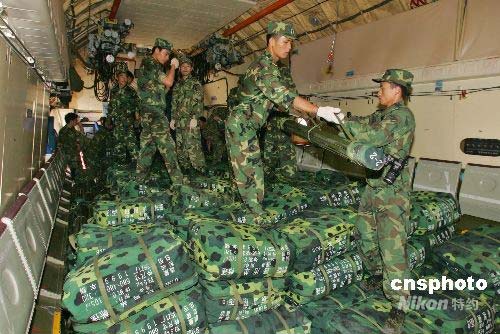 5月17日下午,運(yùn)載著2500頂帳篷的兩架伊爾-76型運(yùn)輸機(jī)從福州起飛,將總重150噸的救災(zāi)物資送往四川地震災(zāi)區(qū)。這是汶川地震發(fā)生后,駐閩部隊(duì)送出的首批救災(zāi)物資。據(jù)了解,該批帳篷為81式班用帳篷,支起后面積可達(dá)30平方米,能同時(shí)容納12人,這批帳篷可解決3萬人臨時(shí)住宿問題。中新社發(fā) 小小 攝