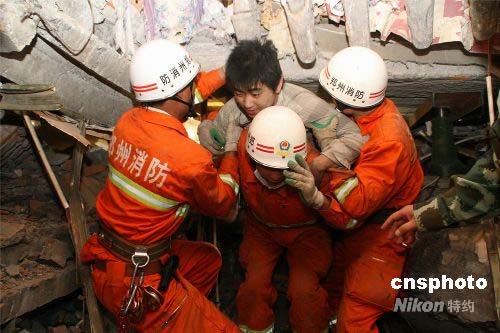 16日晚10時(shí)38分,在地震重災(zāi)區(qū)四川什邡市鎣華鎮(zhèn),鄭州消防支隊(duì)所在的河南總隊(duì)抗震救災(zāi)突擊隊(duì),經(jīng)過(guò)8個(gè)多小時(shí)的連續(xù)奮戰(zhàn),一名被困廢墟中的二十歲男子被成功救出,而此時(shí),他在廢墟中已被困了104小時(shí),他的名字叫李青松。中新社發(fā) 申治民 攝