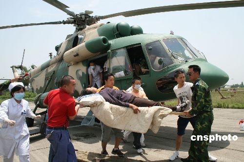 5月18日中午1時(shí)許,首批來(lái)自四川北川縣重災(zāi)區(qū)的20名受重傷群眾,被總參某陸航團(tuán)4架直升機(jī)運(yùn)到空軍駐彭山機(jī)場(chǎng),立即被送到眉山市各主要醫(yī)療單位救治。從當(dāng)天起,一大批來(lái)自北川邊遠(yuǎn)鄉(xiāng)鎮(zhèn)的重傷員將通過(guò)這條“空中生命線(xiàn)”接到眉山救治。中新社發(fā) 堯遙 攝