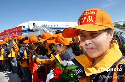 5月18日下午,由新疆多家醫(yī)療機(jī)構(gòu)醫(yī)護(hù)專家組成首批抗震救災(zāi)醫(yī)療防病救援隊(duì)從新疆烏魯木齊國際機(jī)場乘專機(jī)前往四川汶川地震災(zāi)區(qū)實(shí)施醫(yī)療救助和疫情防御工作,同時30噸救援所需的藥品和物資也隨救援隊(duì)一同被運(yùn)往地震災(zāi)區(qū)。據(jù)了解,新疆首批抗震救災(zāi)醫(yī)療防病救援隊(duì)共計90人,由維、漢、哈、回等各族醫(yī)護(hù)工作者組成,其中女性24名。當(dāng)日上午7輛救援工作車已從烏魯木齊出發(fā),趕向四川災(zāi)區(qū),預(yù)計54小時即可到達(dá)災(zāi)區(qū)。中新社發(fā) 劉新 攝