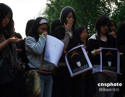 當(dāng)?shù)貢r(shí)間18日晚,數(shù)百名留英中國(guó)學(xué)生和學(xué)者聚集到倫敦大學(xué)亞非學(xué)院,在燭光中為四川地震災(zāi)區(qū)的人民祈禱與祝福。圖為悼念死難者時(shí),手捧蠟燭的留學(xué)生們潸然淚下。中新社發(fā) 李鵬 攝