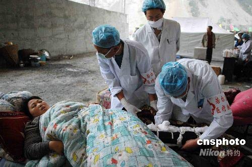 五月十九日,被救出的汶川地震受傷災(zāi)民在野戰(zhàn)醫(yī)院得到救助。由武警醫(yī)療隊、空軍醫(yī)療隊、諾爾蓋醫(yī)療救護(hù)人員組成的聯(lián)合野戰(zhàn)醫(yī)院,目前正在當(dāng)?shù)貙嵤I救。中新社發(fā) 陳文 攝