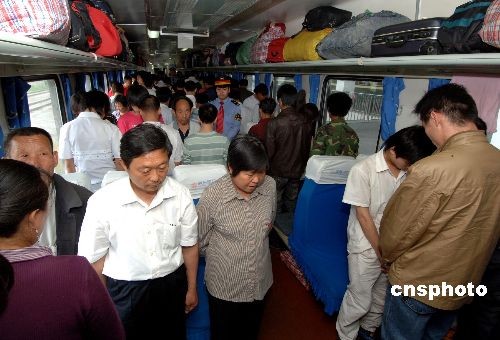 五月十九日十四時二十八分,福州開往青島四方的K68次列車上,乘客一齊起立為四川汶川大地震遇難同胞默哀。這趟列車按運(yùn)行時刻表剛好在此時發(fā)車,由于正值舉國默哀之際,特意推遲三分鐘發(fā)車。中新社發(fā) 王東明 攝