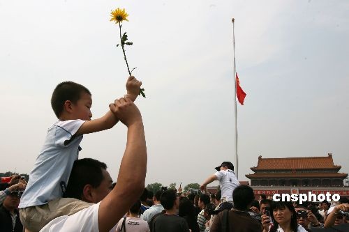 5月19日14時(shí)28分,數(shù)萬(wàn)民眾在北京天安門(mén)廣場(chǎng)為四川汶川大地震遇難者默哀,一名兒童騎在父親肩頭高舉黃菊花表達(dá)哀思。5月19日至21日為中國(guó)全國(guó)哀悼日。中新社發(fā) 王瑤 攝