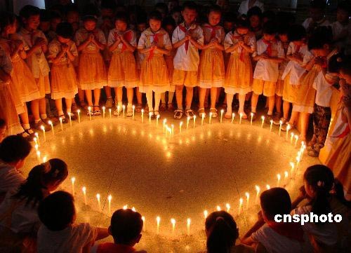 圖:小學(xué)生點燃蠟燭為災(zāi)區(qū)祈禱