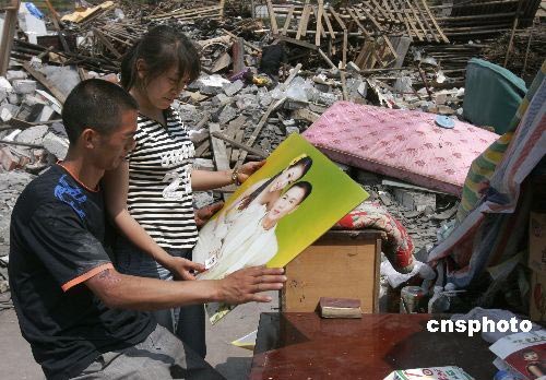 5月19日,四川省什邡市鎣華鎮(zhèn)仁和村三組梁正彬一家正在從廢墟中扒尋自家物品。他們很幸運,災難發(fā)生時,包括老父母和年幼女兒在內的全家5口人都跑出了轟然倒塌的房屋!捌桨簿褪歉# 彼麄兡帐皻埼,準備重建家園。中新社發(fā) 張曉理 攝