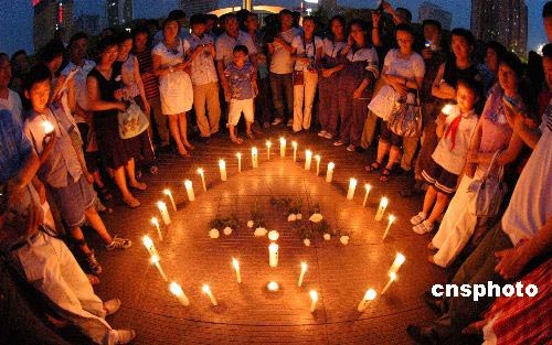5月19日晚,新疆巴音郭楞蒙古自治州(簡稱巴州)團委在新疆庫爾勒市人民廣場舉辦共青團員“點燃蠟燭、寄托對汶川大地震遇難同胞的哀思”活動,為汶川地震遇難同胞默哀。中新社發(fā) 確·胡熱 攝