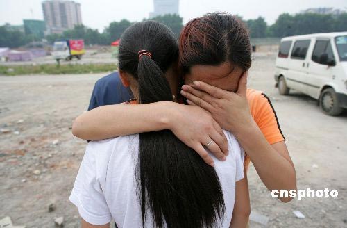 5月20日中午12時(shí)20分,在北川中學(xué)學(xué)生臨時(shí)安置點(diǎn),李春榕找到了尋找了六天的姐姐的女兒——北川中學(xué)初一六班的楊曉丹,在得知父母已不在人世時(shí),楊曉丹與小姨相擁而泣。中新社發(fā) 劉震 攝