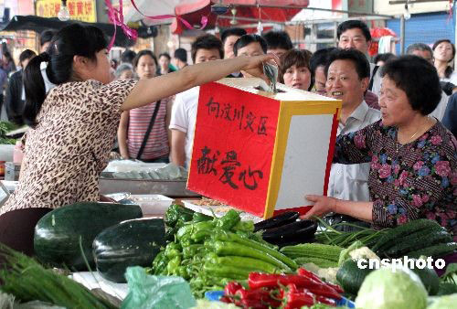 5月21日,浙江省德清縣個(gè)私協(xié)會(huì)乾元分會(huì)和乾元市場(chǎng)開發(fā)服務(wù)所工作人員協(xié)同市場(chǎng)各行業(yè)的經(jīng)營(yíng)組長(zhǎng),發(fā)起向地震災(zāi)區(qū)人民獻(xiàn)愛心活動(dòng),得到市場(chǎng)內(nèi)近300名經(jīng)營(yíng)戶的積極支持和參與,現(xiàn)場(chǎng)共收到愛心捐款一萬(wàn)六千余元。四川的災(zāi)情牽動(dòng)著浙江省德清縣長(zhǎng)橋農(nóng)貿(mào)市場(chǎng)廣大經(jīng)營(yíng)戶的心,截至發(fā)稿時(shí)止,廣大經(jīng)營(yíng)戶捐款活動(dòng)還在繼續(xù)。
