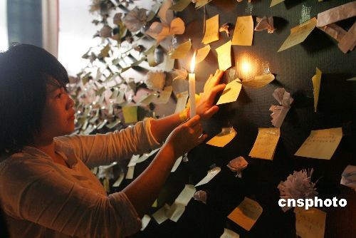在五月十九日到二十一日為期三天的全國(guó)哀悼日里,福州寶龍廣場(chǎng)上豎立的兩面以黑色為背景的哀思?jí)η,許多市民紛紛駐足,悼念四川汶川特大地震遇難同胞。圖為哀悼墻上貼滿(mǎn)人們寫(xiě)下祝福的紙片、紙花,寄托哀思。中新社發(fā) 小小 攝